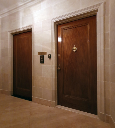Our faux stone blocks are quite different from the standard. We treat each block as a separate painting, building a painterly tonal conversation with rectangles over the whole wall. This application enhances any interior, commercial or residential. In fact a lot or our limestone finish is also on display in the Metropolitan Museum, NYC